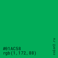 Цвет #01AC58 в цветовой модели RGB обозначается тремя октетами (1, 172, 88) в десятичном формате и #01AC58 в шестнадцатиричном (hex) формате, которые являются интенсивностью красного 1 (hex 01), интенсивность зелёного 172 (hex AC) и интенсивность синего 88 (hex 58).