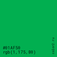 Цвет #01AF50 в цветовой модели RGB обозначается тремя октетами (1, 175, 80) в десятичном формате и #01AF50 в шестнадцатиричном (hex) формате, которые являются интенсивностью красного 1 (hex 01), интенсивность зелёного 175 (hex AF) и интенсивность синего 80 (hex 50).