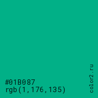 Цвет #01B087 в цветовой модели RGB обозначается тремя октетами (1, 176, 135) в десятичном формате и #01B087 в шестнадцатиричном (hex) формате, которые являются интенсивностью красного 1 (hex 01), интенсивность зелёного 176 (hex B0) и интенсивность синего 135 (hex 87).