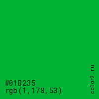 Цвет #01B235 в цветовой модели RGB обозначается тремя октетами (1, 178, 53) в десятичном формате и #01B235 в шестнадцатиричном (hex) формате, которые являются интенсивностью красного 1 (hex 01), интенсивность зелёного 178 (hex B2) и интенсивность синего 53 (hex 35).