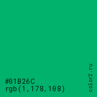 Цвет #01B26C в цветовой модели RGB обозначается тремя октетами (1, 178, 108) в десятичном формате и #01B26C в шестнадцатиричном (hex) формате, которые являются интенсивностью красного 1 (hex 01), интенсивность зелёного 178 (hex B2) и интенсивность синего 108 (hex 6C).
