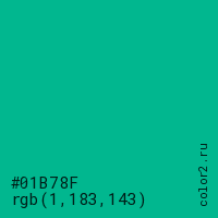 Цвет #01B78F в цветовой модели RGB обозначается тремя октетами (1, 183, 143) в десятичном формате и #01B78F в шестнадцатиричном (hex) формате, которые являются интенсивностью красного 1 (hex 01), интенсивность зелёного 183 (hex B7) и интенсивность синего 143 (hex 8F).