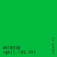 Цвет #01B93B в цветовой модели RGB обозначается тремя октетами (1, 185, 59) в десятичном формате и #01B93B в шестнадцатиричном (hex) формате, которые являются интенсивностью красного 1 (hex 01), интенсивность зелёного 185 (hex B9) и интенсивность синего 59 (hex 3B).