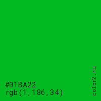 Цвет #01BA22 в цветовой модели RGB обозначается тремя октетами (1, 186, 34) в десятичном формате и #01BA22 в шестнадцатиричном (hex) формате, которые являются интенсивностью красного 1 (hex 01), интенсивность зелёного 186 (hex BA) и интенсивность синего 34 (hex 22).