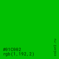 Цвет #01C002 в цветовой модели RGB обозначается тремя октетами (1, 192, 2) в десятичном формате и #01C002 в шестнадцатиричном (hex) формате, которые являются интенсивностью красного 1 (hex 01), интенсивность зелёного 192 (hex C0) и интенсивность синего 2 (hex 02).