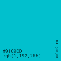 Цвет #01C0CD в цветовой модели RGB обозначается тремя октетами (1, 192, 205) в десятичном формате и #01C0CD в шестнадцатиричном (hex) формате, которые являются интенсивностью красного 1 (hex 01), интенсивность зелёного 192 (hex C0) и интенсивность синего 205 (hex CD).