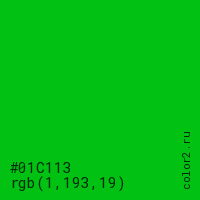 Цвет #01C113 в цветовой модели RGB обозначается тремя октетами (1, 193, 19) в десятичном формате и #01C113 в шестнадцатиричном (hex) формате, которые являются интенсивностью красного 1 (hex 01), интенсивность зелёного 193 (hex C1) и интенсивность синего 19 (hex 13).