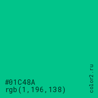 Цвет #01C48A в цветовой модели RGB обозначается тремя октетами (1, 196, 138) в десятичном формате и #01C48A в шестнадцатиричном (hex) формате, которые являются интенсивностью красного 1 (hex 01), интенсивность зелёного 196 (hex C4) и интенсивность синего 138 (hex 8A).