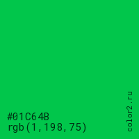 Цвет #01C64B в цветовой модели RGB обозначается тремя октетами (1, 198, 75) в десятичном формате и #01C64B в шестнадцатиричном (hex) формате, которые являются интенсивностью красного 1 (hex 01), интенсивность зелёного 198 (hex C6) и интенсивность синего 75 (hex 4B).