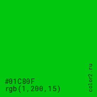 Цвет #01C80F в цветовой модели RGB обозначается тремя октетами (1, 200, 15) в десятичном формате и #01C80F в шестнадцатиричном (hex) формате, которые являются интенсивностью красного 1 (hex 01), интенсивность зелёного 200 (hex C8) и интенсивность синего 15 (hex 0F).