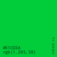 Цвет #01CD3A в цветовой модели RGB обозначается тремя октетами (1, 205, 58) в десятичном формате и #01CD3A в шестнадцатиричном (hex) формате, которые являются интенсивностью красного 1 (hex 01), интенсивность зелёного 205 (hex CD) и интенсивность синего 58 (hex 3A).
