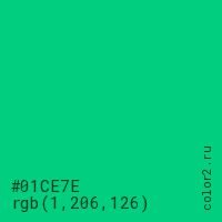 Цвет #01CE7E в цветовой модели RGB обозначается тремя октетами (1, 206, 126) в десятичном формате и #01CE7E в шестнадцатиричном (hex) формате, которые являются интенсивностью красного 1 (hex 01), интенсивность зелёного 206 (hex CE) и интенсивность синего 126 (hex 7E).