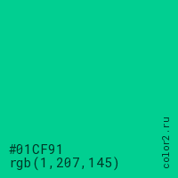 Цвет #01CF91 в цветовой модели RGB обозначается тремя октетами (1, 207, 145) в десятичном формате и #01CF91 в шестнадцатиричном (hex) формате, которые являются интенсивностью красного 1 (hex 01), интенсивность зелёного 207 (hex CF) и интенсивность синего 145 (hex 91).