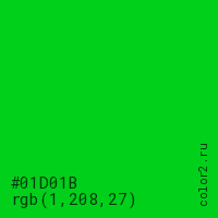 Цвет #01D01B в цветовой модели RGB обозначается тремя октетами (1, 208, 27) в десятичном формате и #01D01B в шестнадцатиричном (hex) формате, которые являются интенсивностью красного 1 (hex 01), интенсивность зелёного 208 (hex D0) и интенсивность синего 27 (hex 1B).