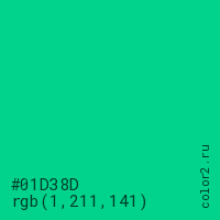 Цвет #01D38D в цветовой модели RGB обозначается тремя октетами (1, 211, 141) в десятичном формате и #01D38D в шестнадцатиричном (hex) формате, которые являются интенсивностью красного 1 (hex 01), интенсивность зелёного 211 (hex D3) и интенсивность синего 141 (hex 8D).