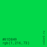 Цвет #01D849 в цветовой модели RGB обозначается тремя октетами (1, 216, 73) в десятичном формате и #01D849 в шестнадцатиричном (hex) формате, которые являются интенсивностью красного 1 (hex 01), интенсивность зелёного 216 (hex D8) и интенсивность синего 73 (hex 49).