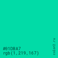 Цвет #01DBA7 в цветовой модели RGB обозначается тремя октетами (1, 219, 167) в десятичном формате и #01DBA7 в шестнадцатиричном (hex) формате, которые являются интенсивностью красного 1 (hex 01), интенсивность зелёного 219 (hex DB) и интенсивность синего 167 (hex A7).