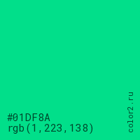 Цвет #01DF8A в цветовой модели RGB обозначается тремя октетами (1, 223, 138) в десятичном формате и #01DF8A в шестнадцатиричном (hex) формате, которые являются интенсивностью красного 1 (hex 01), интенсивность зелёного 223 (hex DF) и интенсивность синего 138 (hex 8A).