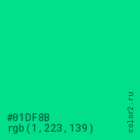 Цвет #01DF8B в цветовой модели RGB обозначается тремя октетами (1, 223, 139) в десятичном формате и #01DF8B в шестнадцатиричном (hex) формате, которые являются интенсивностью красного 1 (hex 01), интенсивность зелёного 223 (hex DF) и интенсивность синего 139 (hex 8B).