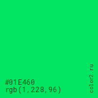 Цвет #01E460 в цветовой модели RGB обозначается тремя октетами (1, 228, 96) в десятичном формате и #01E460 в шестнадцатиричном (hex) формате, которые являются интенсивностью красного 1 (hex 01), интенсивность зелёного 228 (hex E4) и интенсивность синего 96 (hex 60).