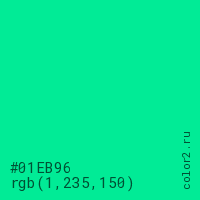 Цвет #01EB96 в цветовой модели RGB обозначается тремя октетами (1, 235, 150) в десятичном формате и #01EB96 в шестнадцатиричном (hex) формате, которые являются интенсивностью красного 1 (hex 01), интенсивность зелёного 235 (hex EB) и интенсивность синего 150 (hex 96).