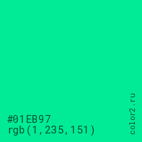 Цвет #01EB97 в цветовой модели RGB обозначается тремя октетами (1, 235, 151) в десятичном формате и #01EB97 в шестнадцатиричном (hex) формате, которые являются интенсивностью красного 1 (hex 01), интенсивность зелёного 235 (hex EB) и интенсивность синего 151 (hex 97).