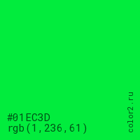 Цвет #01EC3D в цветовой модели RGB обозначается тремя октетами (1, 236, 61) в десятичном формате и #01EC3D в шестнадцатиричном (hex) формате, которые являются интенсивностью красного 1 (hex 01), интенсивность зелёного 236 (hex EC) и интенсивность синего 61 (hex 3D).