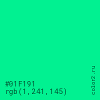Цвет #01F191 в цветовой модели RGB обозначается тремя октетами (1, 241, 145) в десятичном формате и #01F191 в шестнадцатиричном (hex) формате, которые являются интенсивностью красного 1 (hex 01), интенсивность зелёного 241 (hex F1) и интенсивность синего 145 (hex 91).