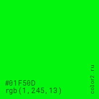 Цвет #01F50D в цветовой модели RGB обозначается тремя октетами (1, 245, 13) в десятичном формате и #01F50D в шестнадцатиричном (hex) формате, которые являются интенсивностью красного 1 (hex 01), интенсивность зелёного 245 (hex F5) и интенсивность синего 13 (hex 0D).