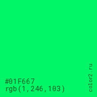 Цвет #01F667 в цветовой модели RGB обозначается тремя октетами (1, 246, 103) в десятичном формате и #01F667 в шестнадцатиричном (hex) формате, которые являются интенсивностью красного 1 (hex 01), интенсивность зелёного 246 (hex F6) и интенсивность синего 103 (hex 67).