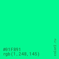 Цвет #01F891 в цветовой модели RGB обозначается тремя октетами (1, 248, 145) в десятичном формате и #01F891 в шестнадцатиричном (hex) формате, которые являются интенсивностью красного 1 (hex 01), интенсивность зелёного 248 (hex F8) и интенсивность синего 145 (hex 91).