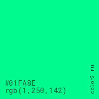 Цвет #01FA8E в цветовой модели RGB обозначается тремя октетами (1, 250, 142) в десятичном формате и #01FA8E в шестнадцатиричном (hex) формате, которые являются интенсивностью красного 1 (hex 01), интенсивность зелёного 250 (hex FA) и интенсивность синего 142 (hex 8E).