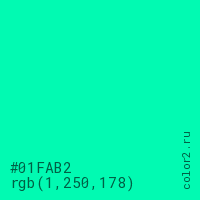 Цвет #01FAB2 в цветовой модели RGB обозначается тремя октетами (1, 250, 178) в десятичном формате и #01FAB2 в шестнадцатиричном (hex) формате, которые являются интенсивностью красного 1 (hex 01), интенсивность зелёного 250 (hex FA) и интенсивность синего 178 (hex B2).