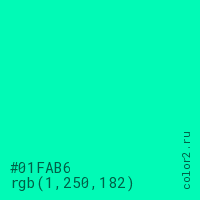 Цвет #01FAB6 в цветовой модели RGB обозначается тремя октетами (1, 250, 182) в десятичном формате и #01FAB6 в шестнадцатиричном (hex) формате, которые являются интенсивностью красного 1 (hex 01), интенсивность зелёного 250 (hex FA) и интенсивность синего 182 (hex B6).