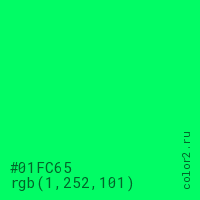 Цвет #01FC65 в цветовой модели RGB обозначается тремя октетами (1, 252, 101) в десятичном формате и #01FC65 в шестнадцатиричном (hex) формате, которые являются интенсивностью красного 1 (hex 01), интенсивность зелёного 252 (hex FC) и интенсивность синего 101 (hex 65).
