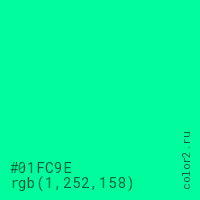 Цвет #01FC9E в цветовой модели RGB обозначается тремя октетами (1, 252, 158) в десятичном формате и #01FC9E в шестнадцатиричном (hex) формате, которые являются интенсивностью красного 1 (hex 01), интенсивность зелёного 252 (hex FC) и интенсивность синего 158 (hex 9E).