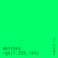 Цвет #01FD69 в цветовой модели RGB обозначается тремя октетами (1, 253, 105) в десятичном формате и #01FD69 в шестнадцатиричном (hex) формате, которые являются интенсивностью красного 1 (hex 01), интенсивность зелёного 253 (hex FD) и интенсивность синего 105 (hex 69).