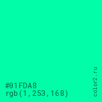 Цвет #01FDA8 в цветовой модели RGB обозначается тремя октетами (1, 253, 168) в десятичном формате и #01FDA8 в шестнадцатиричном (hex) формате, которые являются интенсивностью красного 1 (hex 01), интенсивность зелёного 253 (hex FD) и интенсивность синего 168 (hex A8).