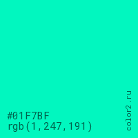 Цвет #01F7BF в цветовой модели RGB обозначается тремя октетами (1, 247, 191) в десятичном формате и #01F7BF в шестнадцатиричном (hex) формате, которые являются интенсивностью красного 1 (hex 01), интенсивность зелёного 247 (hex F7) и интенсивность синего 191 (hex BF).