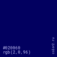 Цвет #020060 в цветовой модели RGB обозначается тремя октетами (2, 0, 96) в десятичном формате и #020060 в шестнадцатиричном (hex) формате, которые являются интенсивностью красного 2 (hex 02), интенсивность зелёного 0 (hex 00) и интенсивность синего 96 (hex 60).