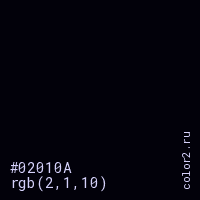 Цвет #02010A в цветовой модели RGB обозначается тремя октетами (2, 1, 10) в десятичном формате и #02010A в шестнадцатиричном (hex) формате, которые являются интенсивностью красного 2 (hex 02), интенсивность зелёного 1 (hex 01) и интенсивность синего 10 (hex 0A).