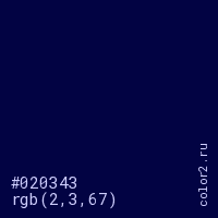 Цвет #020343 в цветовой модели RGB обозначается тремя октетами (2, 3, 67) в десятичном формате и #020343 в шестнадцатиричном (hex) формате, которые являются интенсивностью красного 2 (hex 02), интенсивность зелёного 3 (hex 03) и интенсивность синего 67 (hex 43).
