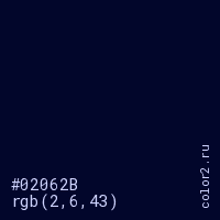 Цвет #02062B в цветовой модели RGB обозначается тремя октетами (2, 6, 43) в десятичном формате и #02062B в шестнадцатиричном (hex) формате, которые являются интенсивностью красного 2 (hex 02), интенсивность зелёного 6 (hex 06) и интенсивность синего 43 (hex 2B).