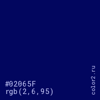 Цвет #02065F в цветовой модели RGB обозначается тремя октетами (2, 6, 95) в десятичном формате и #02065F в шестнадцатиричном (hex) формате, которые являются интенсивностью красного 2 (hex 02), интенсивность зелёного 6 (hex 06) и интенсивность синего 95 (hex 5F).
