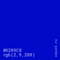 Цвет #0209C8 в цветовой модели RGB обозначается тремя октетами (2, 9, 200) в десятичном формате и #0209C8 в шестнадцатиричном (hex) формате, которые являются интенсивностью красного 2 (hex 02), интенсивность зелёного 9 (hex 09) и интенсивность синего 200 (hex C8).