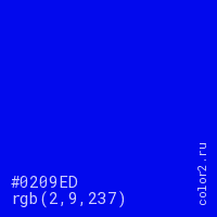 Цвет #0209ED в цветовой модели RGB обозначается тремя октетами (2, 9, 237) в десятичном формате и #0209ED в шестнадцатиричном (hex) формате, которые являются интенсивностью красного 2 (hex 02), интенсивность зелёного 9 (hex 09) и интенсивность синего 237 (hex ED).