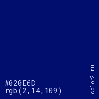 Цвет #020E6D в цветовой модели RGB обозначается тремя октетами (2, 14, 109) в десятичном формате и #020E6D в шестнадцатиричном (hex) формате, которые являются интенсивностью красного 2 (hex 02), интенсивность зелёного 14 (hex 0E) и интенсивность синего 109 (hex 6D).