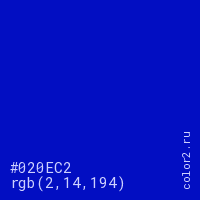Цвет #020EC2 в цветовой модели RGB обозначается тремя октетами (2, 14, 194) в десятичном формате и #020EC2 в шестнадцатиричном (hex) формате, которые являются интенсивностью красного 2 (hex 02), интенсивность зелёного 14 (hex 0E) и интенсивность синего 194 (hex C2).