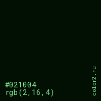 Цвет #021004 в цветовой модели RGB обозначается тремя октетами (2, 16, 4) в десятичном формате и #021004 в шестнадцатиричном (hex) формате, которые являются интенсивностью красного 2 (hex 02), интенсивность зелёного 16 (hex 10) и интенсивность синего 4 (hex 04).