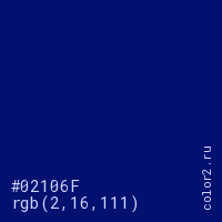 Цвет #02106F в цветовой модели RGB обозначается тремя октетами (2, 16, 111) в десятичном формате и #02106F в шестнадцатиричном (hex) формате, которые являются интенсивностью красного 2 (hex 02), интенсивность зелёного 16 (hex 10) и интенсивность синего 111 (hex 6F).